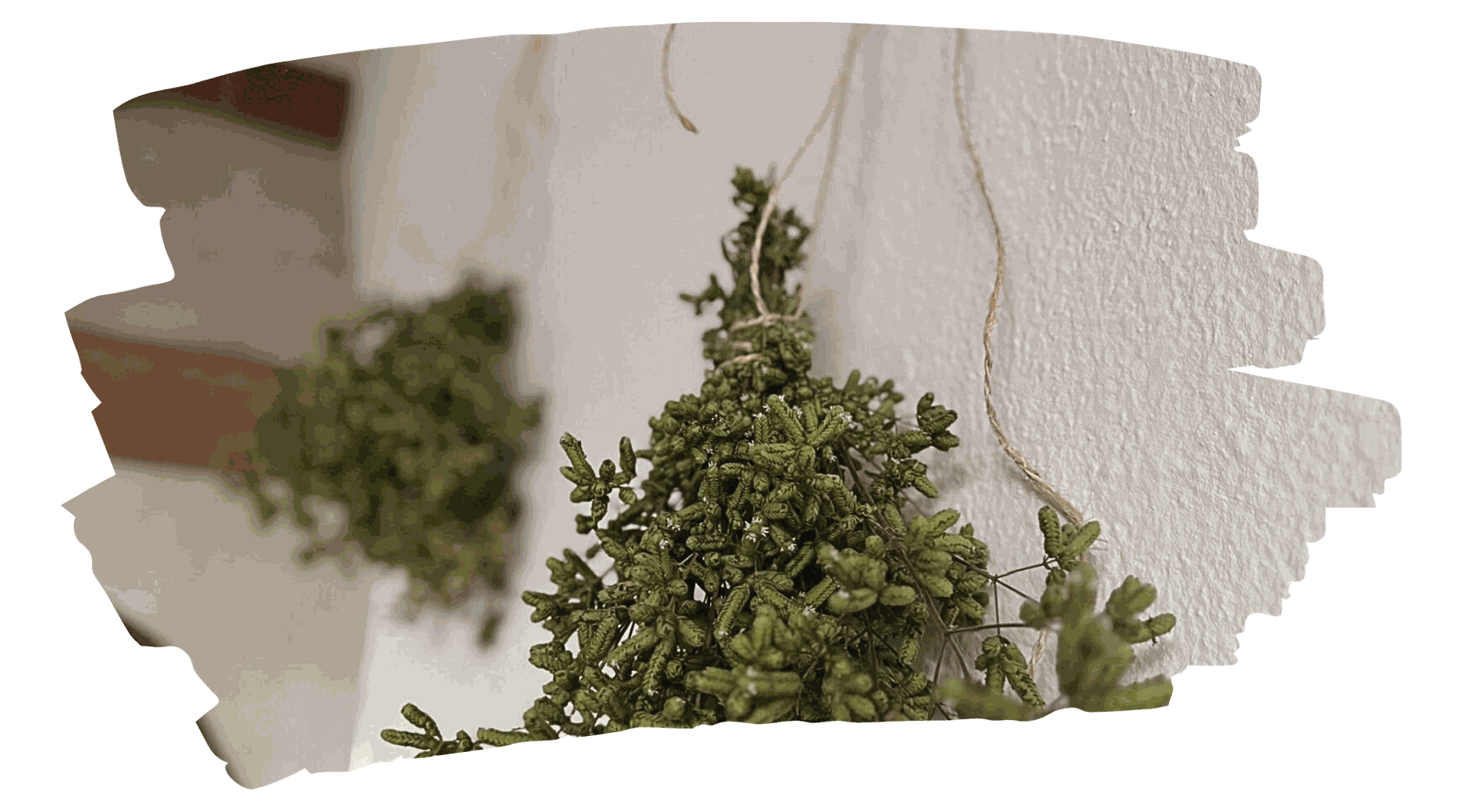 Ata con una cuerda las ramas de orégano cosechadas y cuélgalas en forma de ramillete boca abajo en un lugar oscuro, seco y bien ventilado. Por ejemplo, puede ser una zona de la cocina sin luz directa, o un pasillo o recibidor.